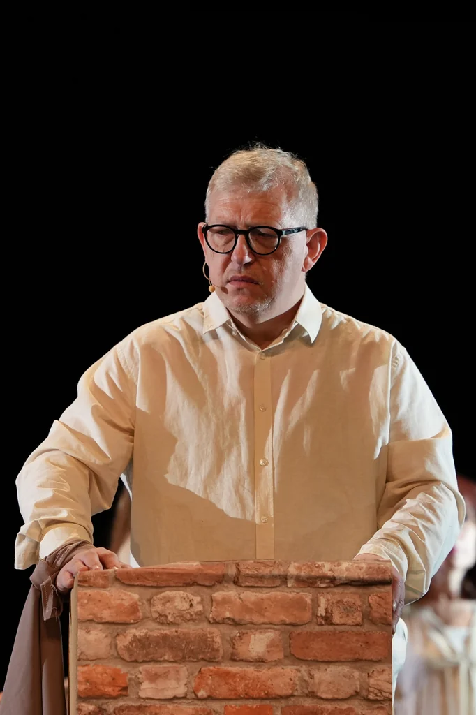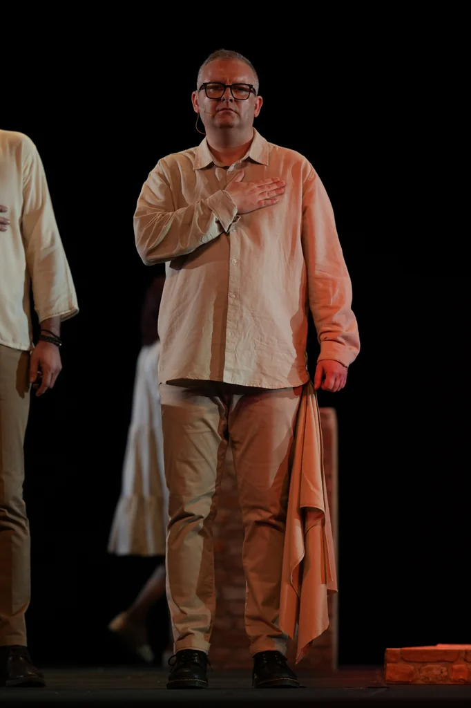 „Teksty Magdaleny Szpunar i moje nadają mu formę liryczną, fragmentaryczną, może nawet intymną. To nie jest historia jednej osoby, tylko wielu głosów: dziecka, matki, świadka, kogoś, kto został, i kogoś, kto musiał uciekać. Scena nie była przeładowana, raczej symboliczna. Może zbudowana z ruin, światła i dźwięku. Takie spektakle często nie są tylko o wojnie, ale o tym, co z człowiekiem robi jej doświadczenie. Tytuł „Wstań już południe” może brzmieć jak wezwanie do przebudzenia, do zobaczenia prawdy, do reakcji. Południe jako moment pełnego światła: kiedy nie da się już niczego ukryć. Byłem cząsteczką tego spektaklu. Byłem na scenie z pięknymi zaangażowanymi ludźmi, którzy są dla mnie bardzo, bardzo ważni”.