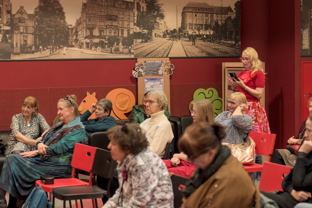 Biblioteka czekała na nas otwarta, zastawiona krzesełkami i fotelami, na których bujaliśmy się w rytm wersów. Głodni strof miłośnicy poezji dopisali – i to nie tylko panie. Były wzruszenia, błyski spojrzeń, a w oczach zakręciły się łzy.