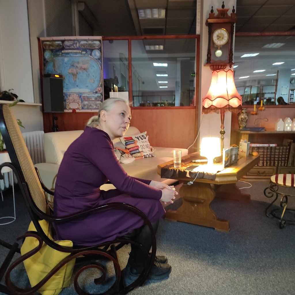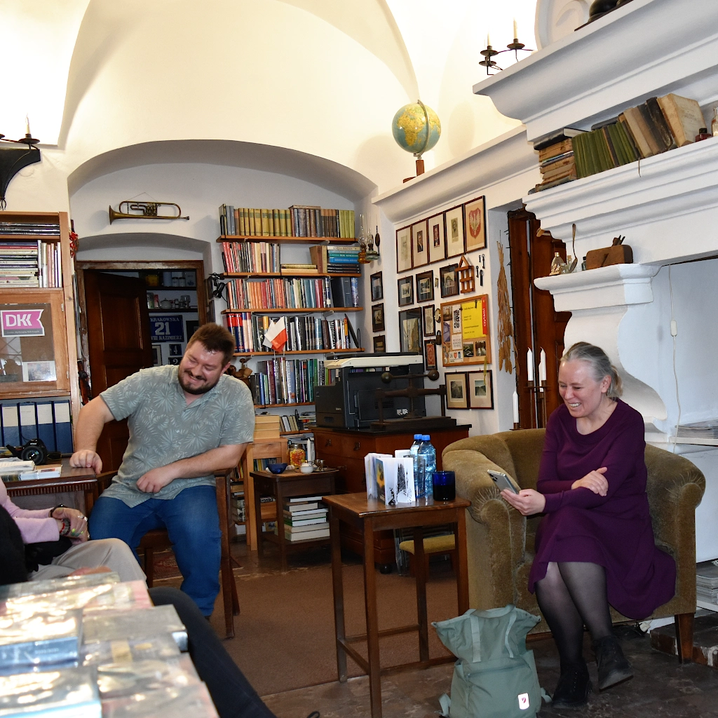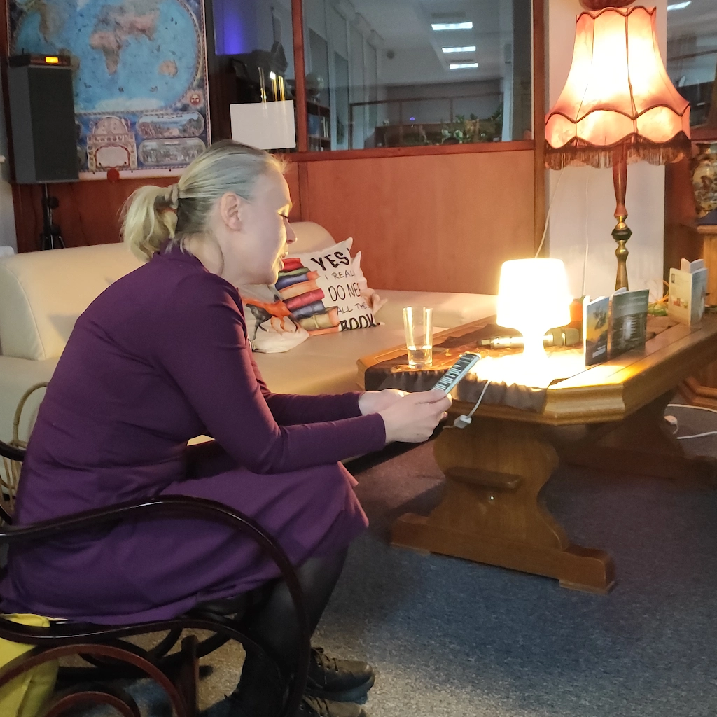 Dziękujemy paniom bibliotekarkom za ciepłe przyjęcie, nastrojowe oświetlenie i bujane fotele.