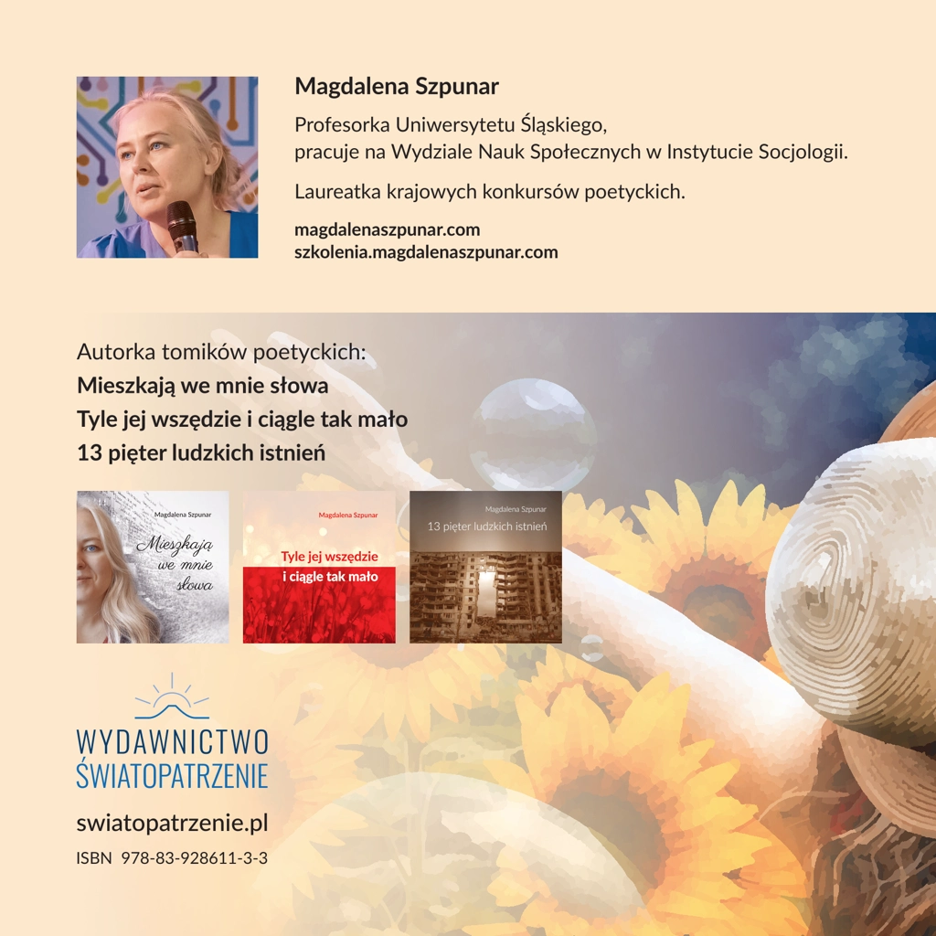 W poezji Magdaleny Szpunar jest wszystko czego brakuje we współczesności. Jest wrażliwość, protest przeciw złu, ale też afirmacja dobra i miłości. Jest kobieca delikatność i twardość spostrzeżeń i ocen. Ta poezja pozwala spojrzeć w siebie, w swoje życiowe doświadczenia, ale także obejrzeć współczesne społeczeństwa i nasze w nich miejsce.