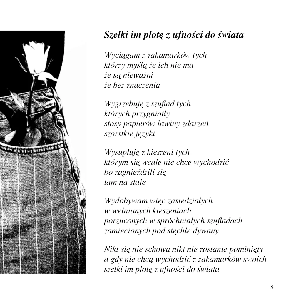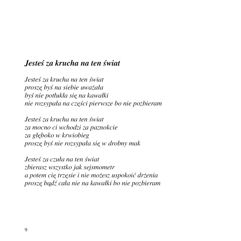 Poezja Magdaleny Szpunar to wielka manifestacja wrażliwości, społecznego zaangażowania i emocjonalnej szczodrości, nie skrytej za żadną maską: uczuć tak łatwych do cynicznego wykpienia a jednocześnie tak poszukiwanych w literaturze i upragnionych przez wielu. To wiersze o sprawach najważniejszych - zarówno w perspektywie wspólnoty jak i w ujęciu bardzo osobistym, wręcz intymnym.