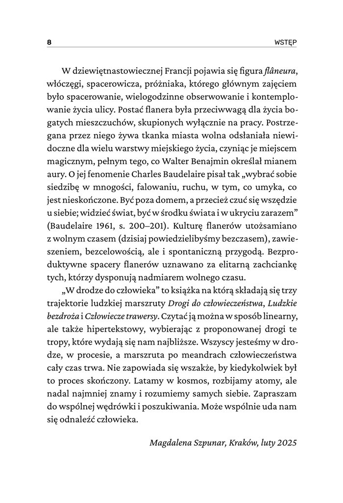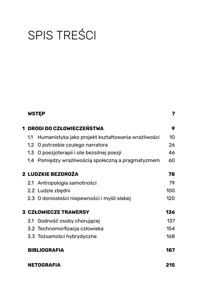 Autorka analizuje drogi do człowieczeństwa, ukazując, jak historia i kultura kształtują nasze wybory i tożsamość. Autorka prowadzi nas przez ludzkie bezdroża, pokazując w jaki sposób nieoczywiste wybory, kryzysy i pęknięcia wyznaczają marszrutę egzystencjalnej wędrówki. Książka skłania do refleksji nad nami samymi i człowieczymi trawersami, gdzie wędrówka staje się sposobem rozumienia świata i siebie.